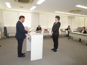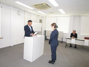 辞令交付と会長、社長、役員挨拶と新入社員の決意表明が行われました。